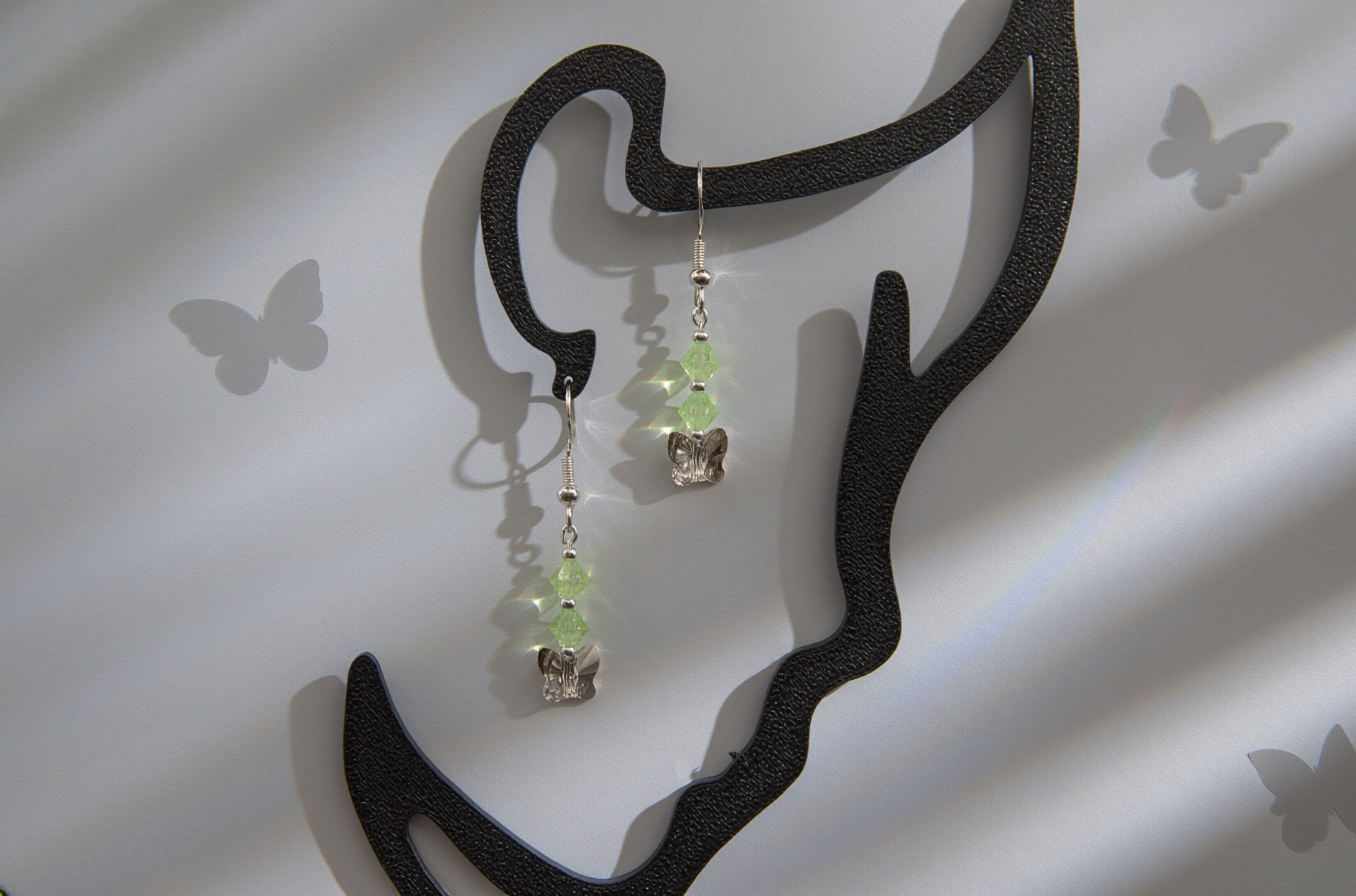 Delicate and full of sparkle, these handmade earrings feature shimmering Swarovski crystal beads in a refreshing aqua-green tone, perfectly paired with charming crystal butterfly accents. Every movement catches the light, creating a dazzling play of colour and brilliance.
