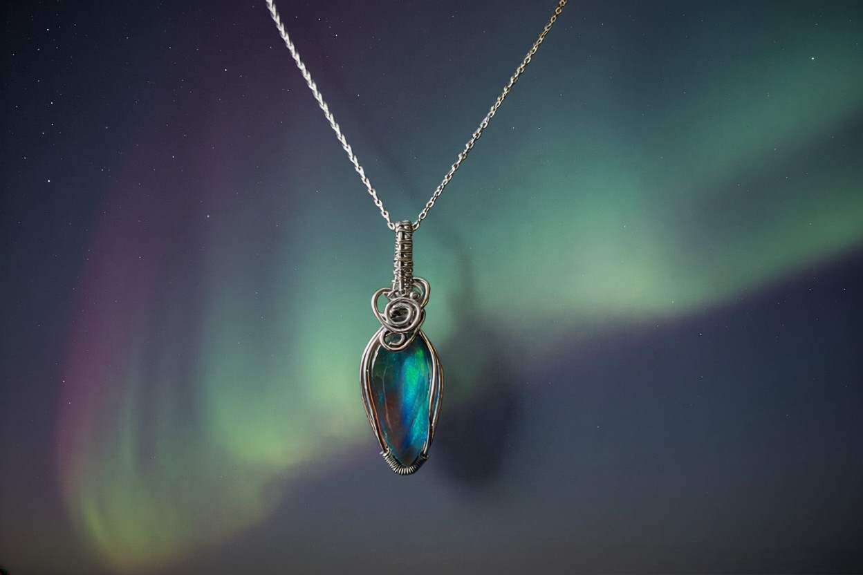 Embrace the enchanting glow of this Aurora Opal necklace, delicately hand-wrapped in sterling silver to highlight its luminous, colour-shifting beauty. The pendant measures approximately 4.5cm in length, creating a graceful statement piece that shimmers with vibrant flashes reminiscent of the Northern Lights.