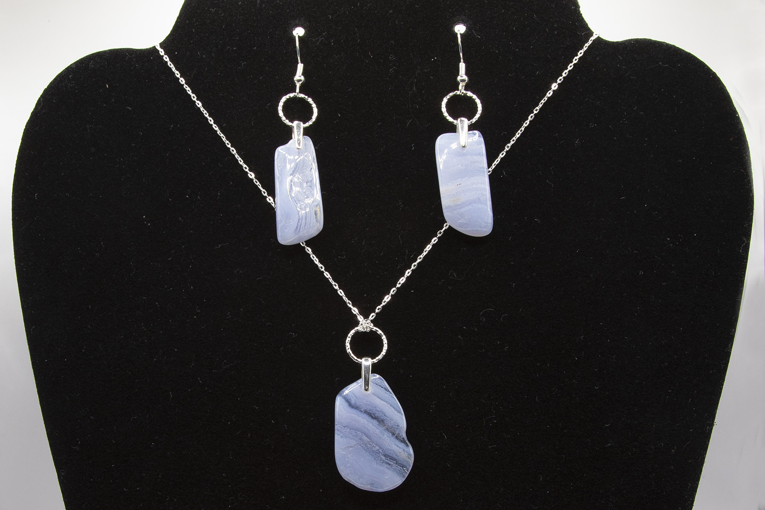 Soft, serene, and effortlessly soulful—this handcrafted jewellery set features a beautifully matched necklace and earrings made with calming Blue Lace Agate and hallmarked sterling silver. Each piece is lovingly created in our own workshop, using hand-polished stones that showcase Blue Lace Agate’s dreamy swirls of pale blue and delicate banding.