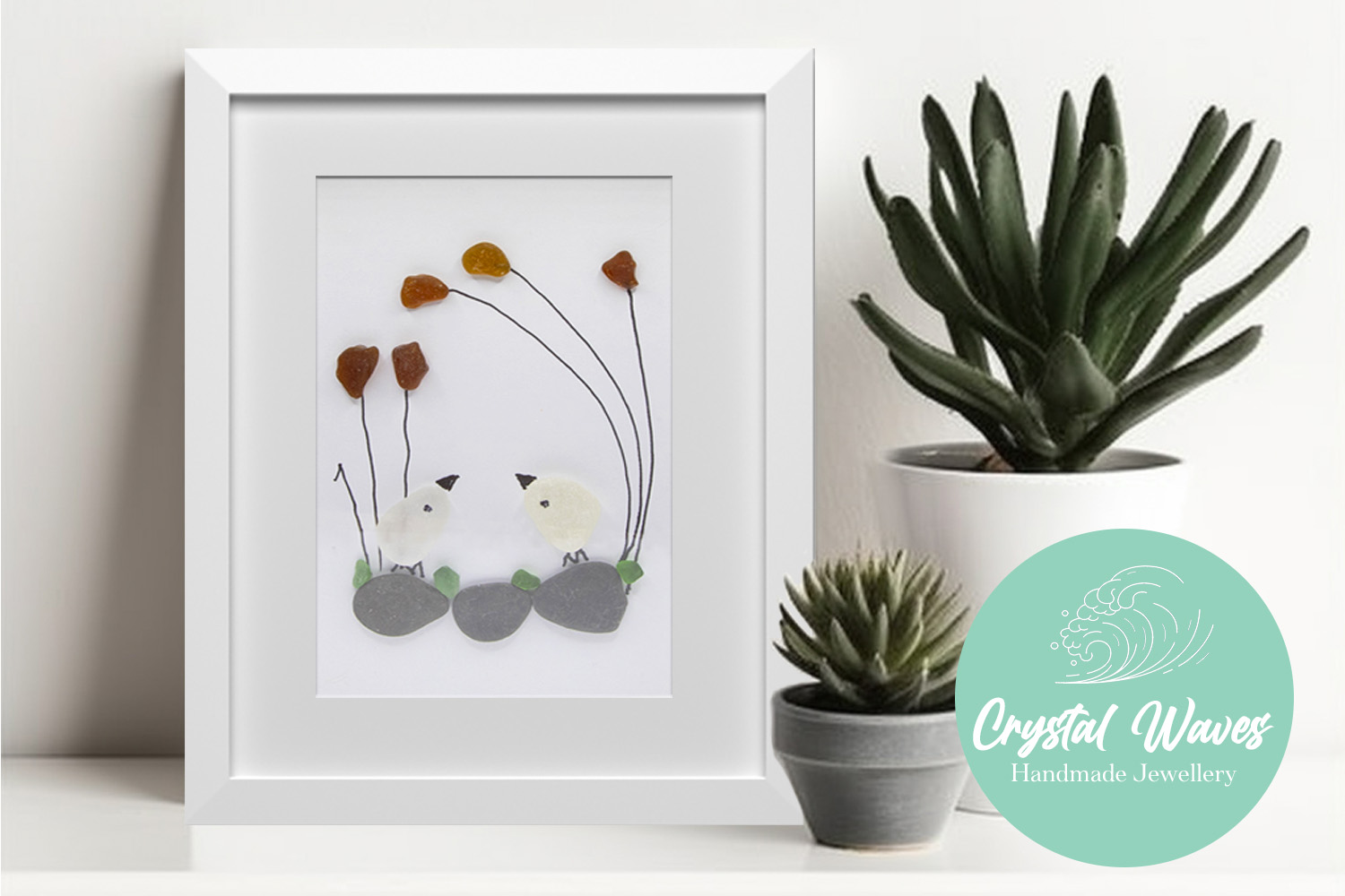 These two adorable little sea glass birds are perched contentedly beneath their beautiful Amber sea glass flowers, creating a heartwarming scene that brings a touch of charm to any space. The perfect blend of nature and art, this piece adds a delightful touch to your home or makes a thoughtful gift for someone special.