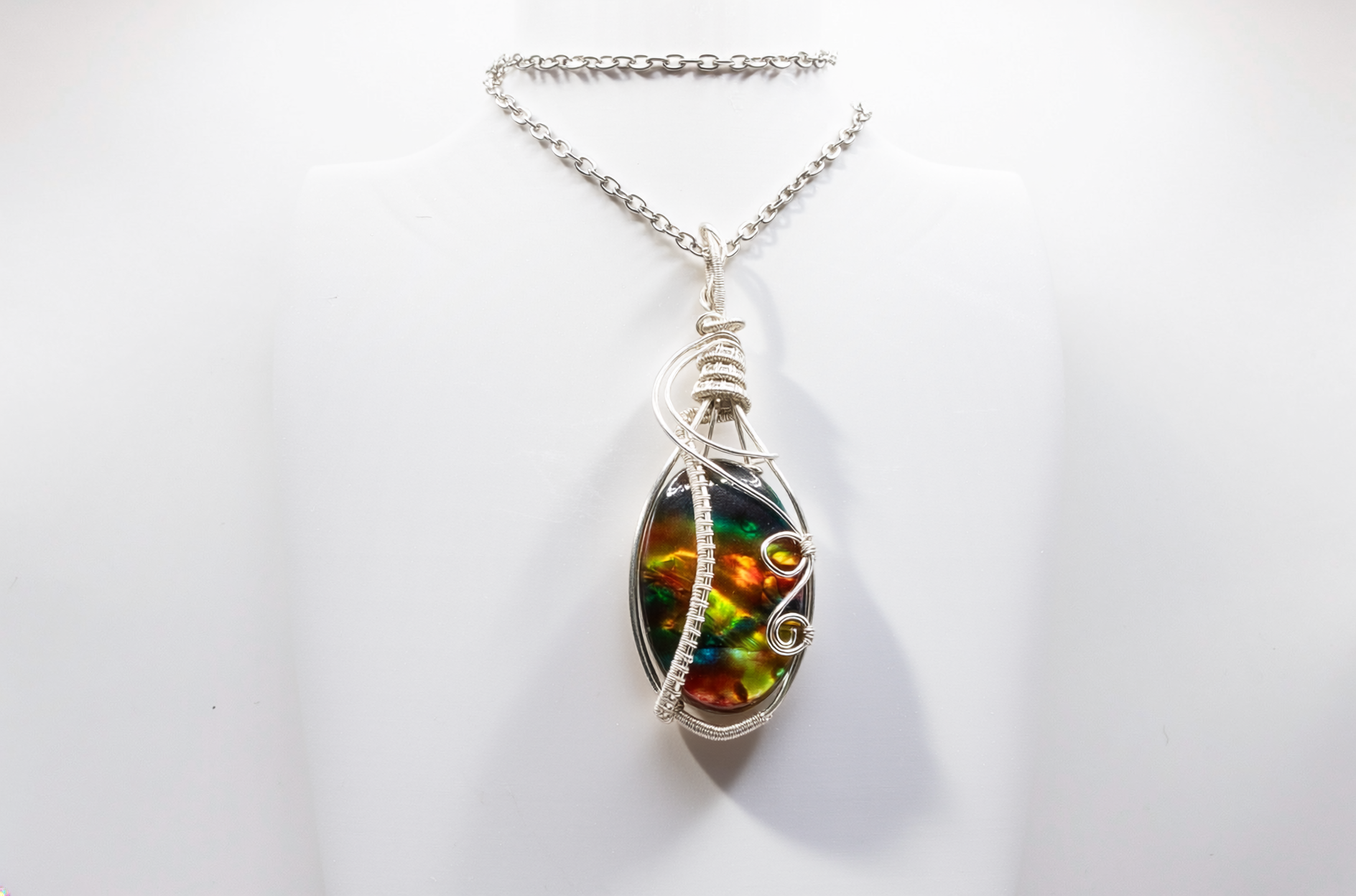 Captivating and radiant, this pendant showcases a shimmering piece of dichroic glass, hand-wrapped in silver-plated wire to highlight its dazzling rainbow colours. Suspended from a graceful 22″ chain, it catches the light from every angle, creating a mesmerizing play of colour and brilliance.
