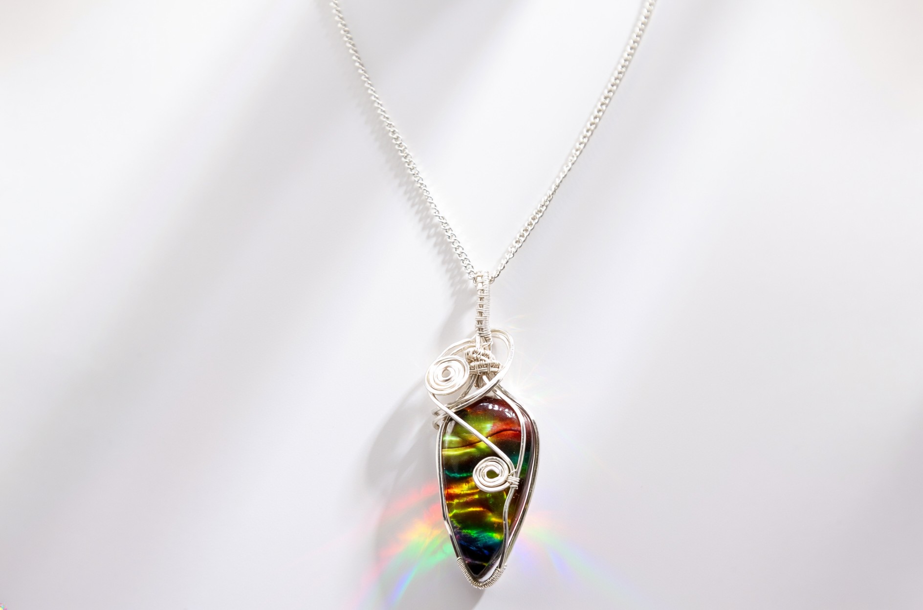 A stunning piece of handmade Dichroic glass, wire-wrapped in silver-plated wire and hung on an 18″ chain. Each pendant shimmers with shifting colours that change in the light — truly one of a kind.