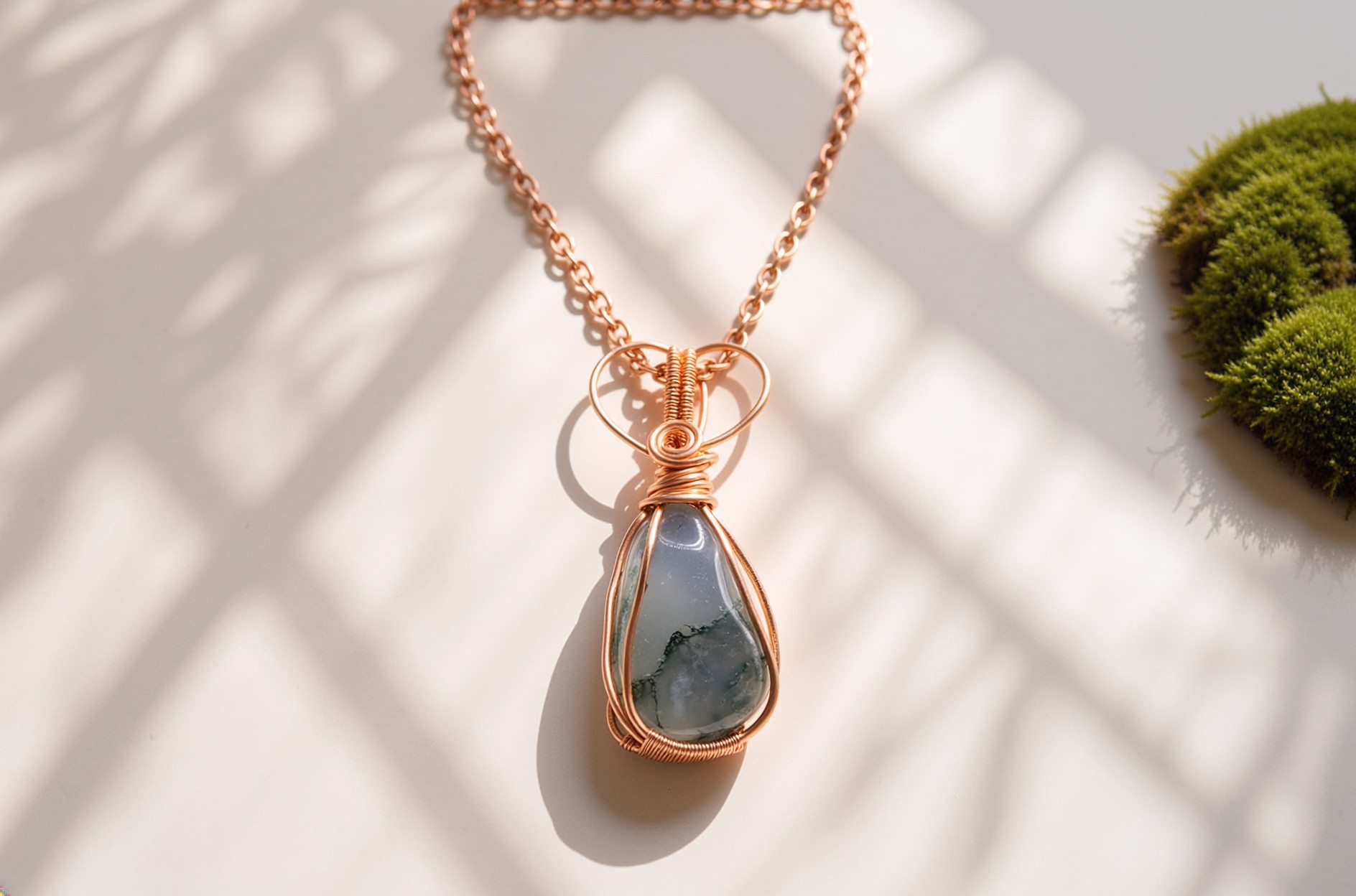 “Earthbound Light” – Moss Agate Wrapped in Copper