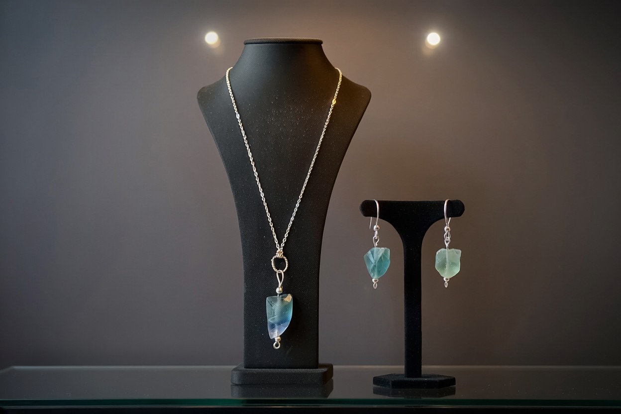 A piece of quiet clarity, this hand-made necklace and matching earrings set by Crystal Waves features luminous fluorite stones, each gently suspended in sterling silver and paired with an elegant 18-inch chain.