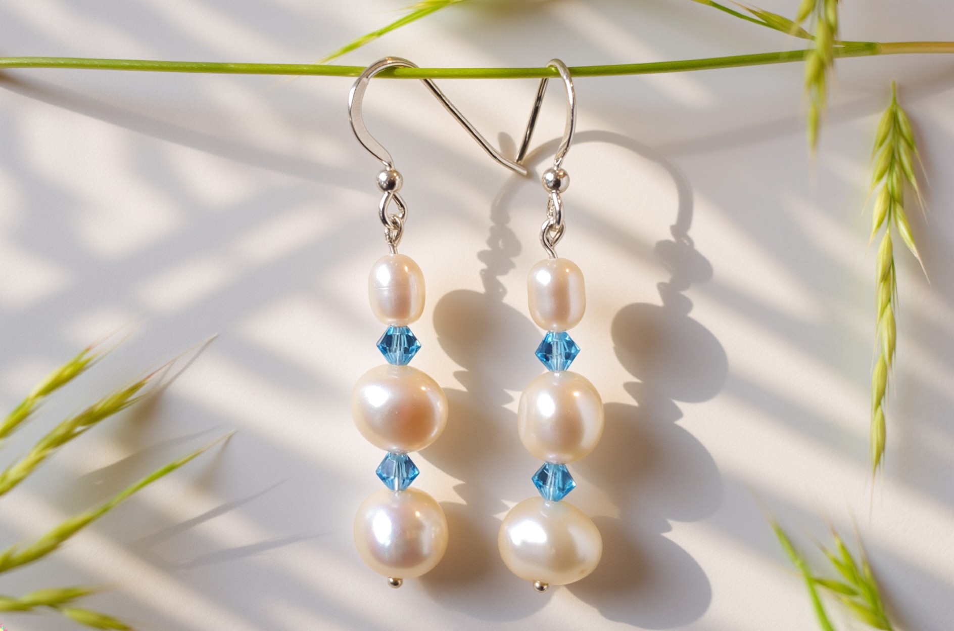 A delicate, handcrafted pair that blends classic elegance with a touch of colour and sparkle. Soft, luminous freshwater pearls are beautifully complemented by stunning sea blue Swarovski crystals, which catch the light with every movement and add a fresh, coastal-inspired shimmer.