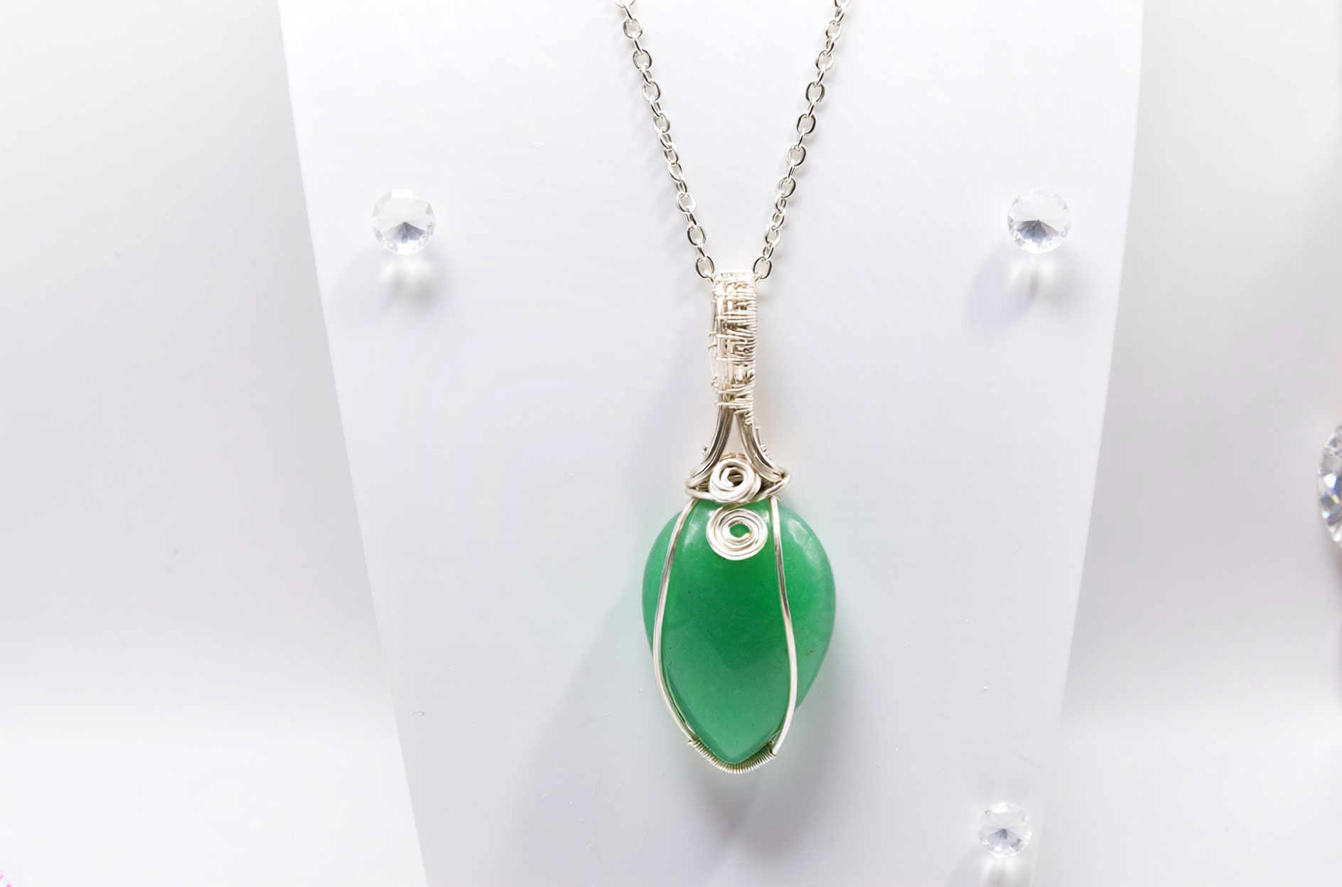 This soulful necklace features a genuine piece of green aventurine, lovingly hand-wrapped in silver wire to honour the natural flow and energy of the stone. Suspended on a fine silver chain, each piece is unique—its soft, mossy green tones reflecting the calm and renewal of nature itself.