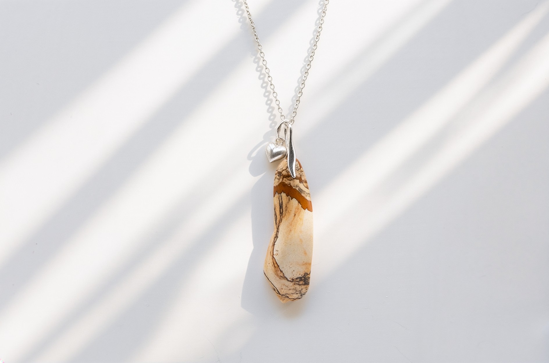 This captivating necklace showcases a beautifully patterned piece of picture jasper, paired with a delicate sterling silver heart charm—both suspended on a sleek silver chain. Each stone tells a story of the earth’s landscapes, with unique swirls and earthy tones that make every necklace one-of-a-kind.