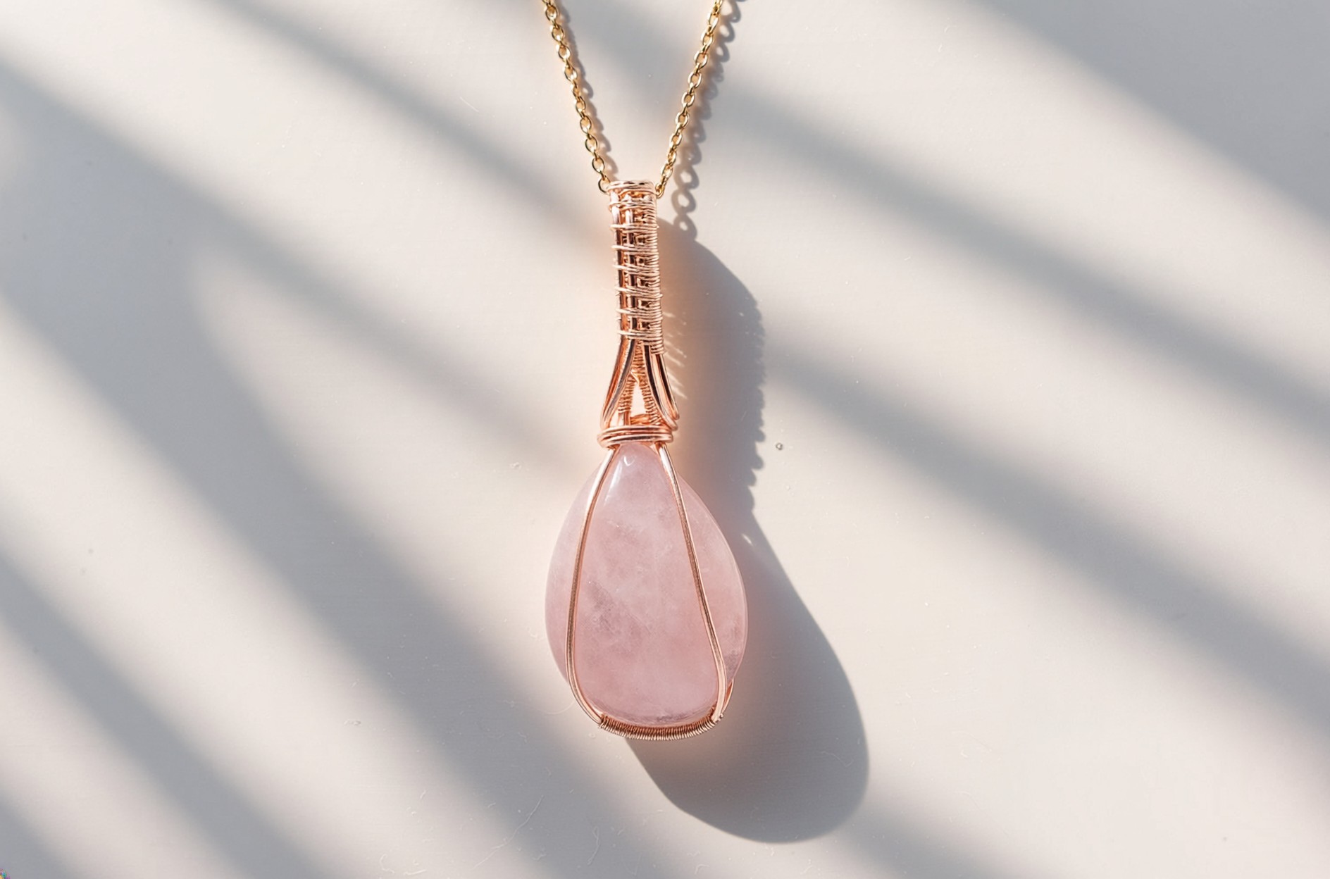 This enchanting pendant features a smooth rose quartz cabochon, lovingly wrapped in warm rose gold plated wire that cradles the stone while enhancing its natural beauty and energy. Each piece is uniquely handcrafted, allowing the soft pink hues and gentle glow of rose quartz to shine through.