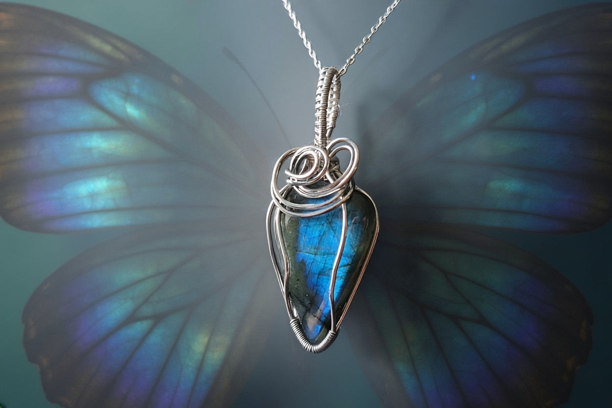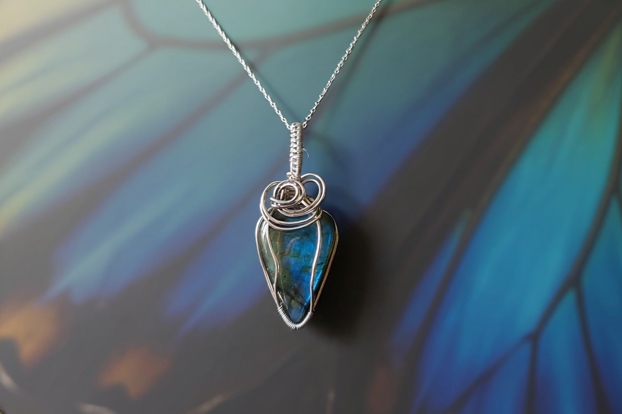 Discover the captivating beauty of this Labradorite necklace, expertly hand-wrapped in sterling silver to showcase the stone’s natural depth and iridescent flashes. The pendant itself measures approximately 5cm in length, making it a bold yet elegant statement piece that catches the light with every movement, revealing stunning tones of blue, green, and gold.