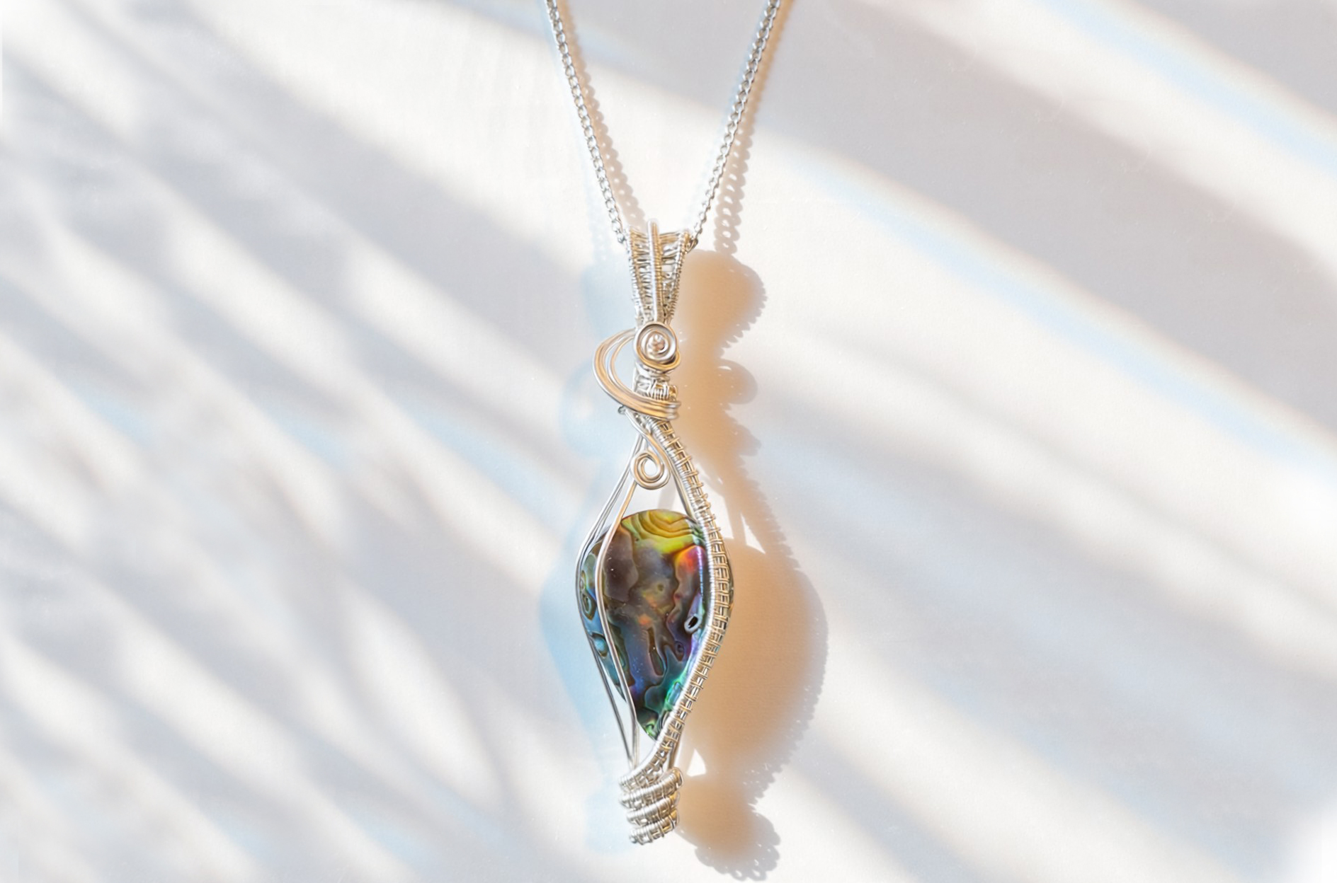 This beautiful Paua shell necklace is hand-wrapped in silver-coloured wire, highlighting the shell’s natural iridescent blues, greens, and purples. Each piece is unique, showcasing the organic patterns and shimmering colours that make Paua shells so captivating.