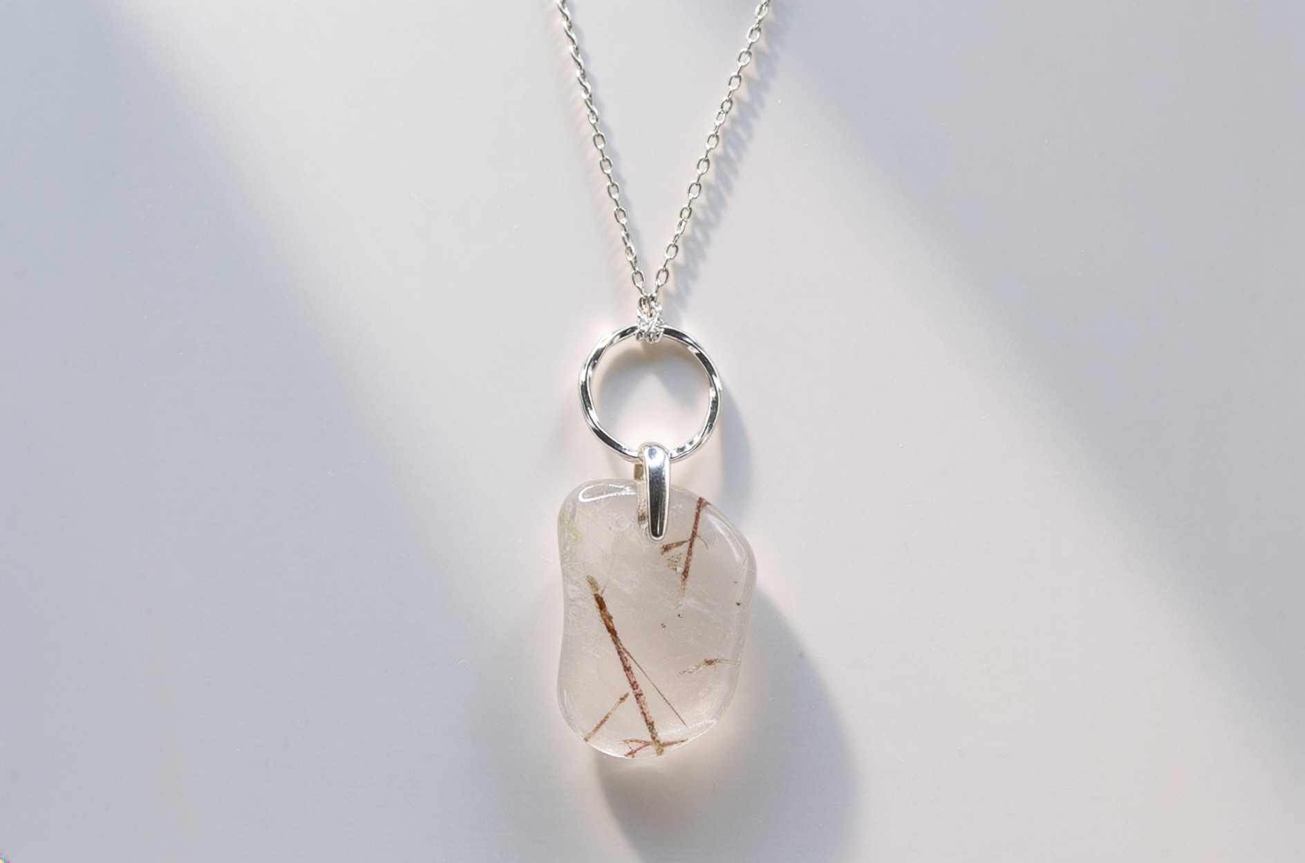 This stunning pendant features a smooth, rounded rutilated quartz stone, beautifully set in sterling silver and accented with a sleek silver hoop that connects the stone to a delicate chain. Handcrafted with precision, this piece highlights the stone’s natural golden rutile strands and luminous depth.