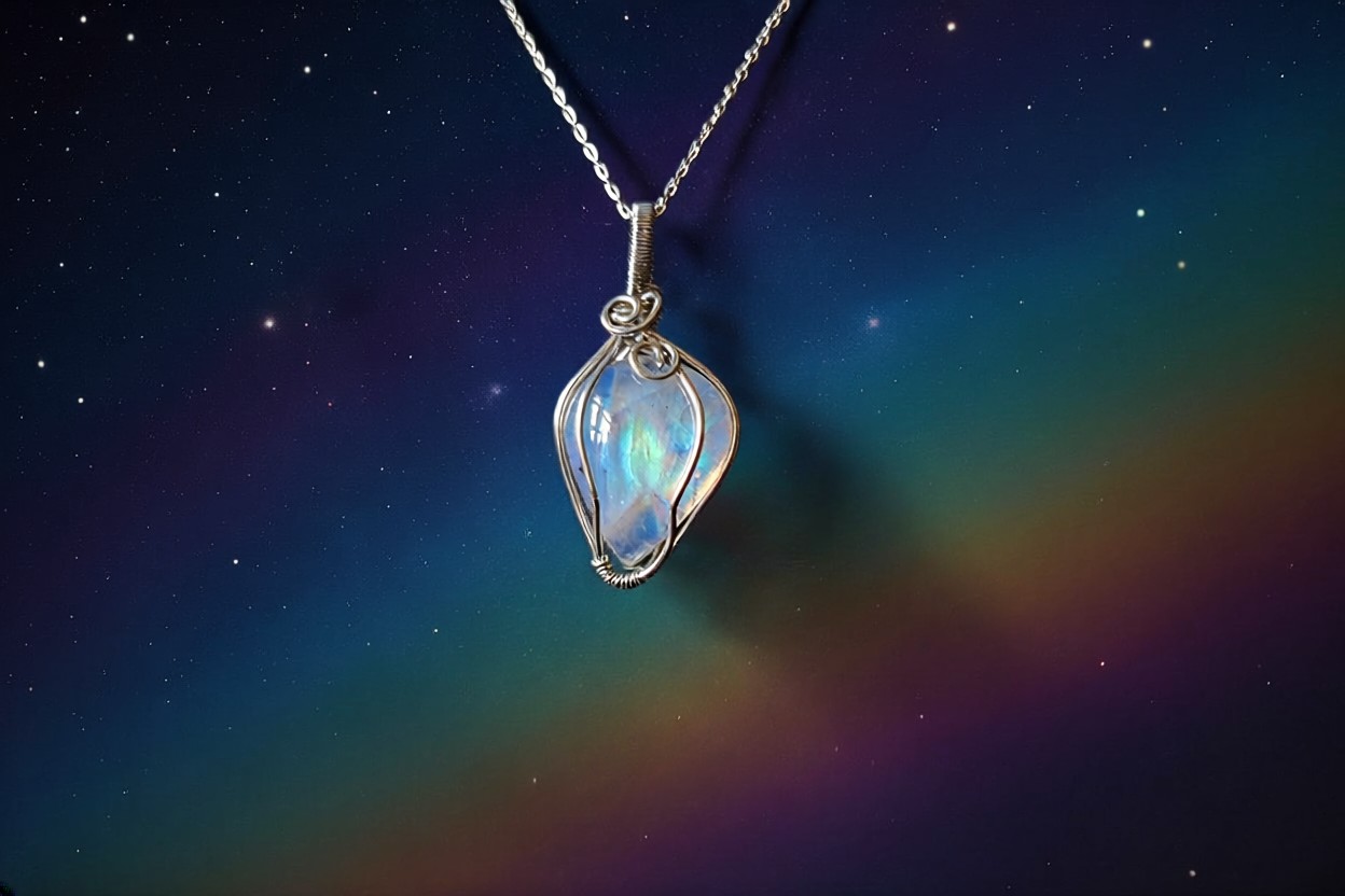 Capture the magic of light with this stunning Rainbow Moonstone necklace, beautifully hand-wrapped in sterling silver to enhance its natural glow and iridescence. The pendant itself measures approximately 4cm in length, creating an eye-catching yet elegant focal point that shimmers with flashes of soft blues and subtle rainbow hues as it catches the light.