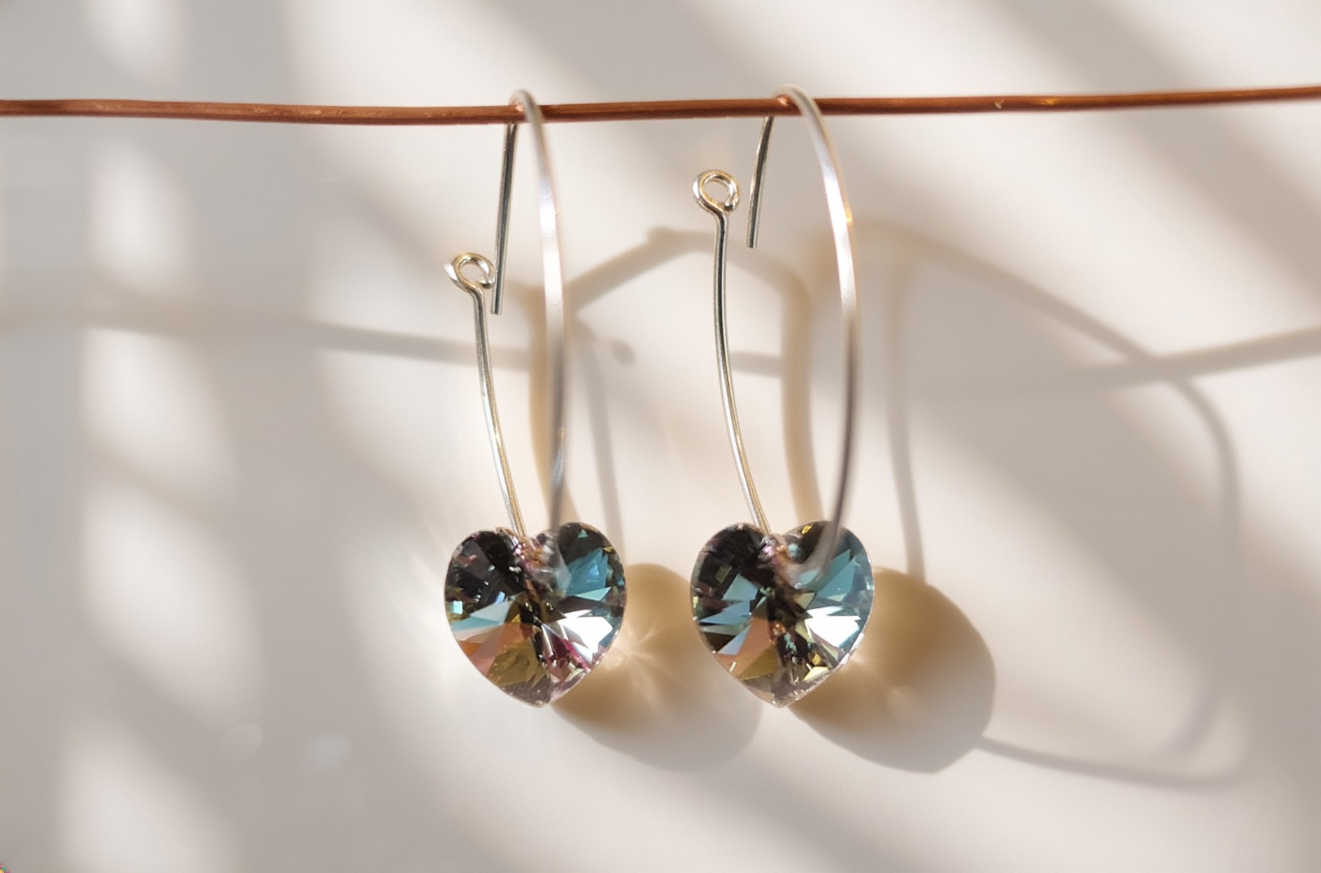 These elegant earrings feature smoky-coloured Swarovski crystal hearts delicately set onto large sterling silver hoops. The subtle, glittering shimmer of the crystals adds a sophisticated touch while catching the light beautifully.