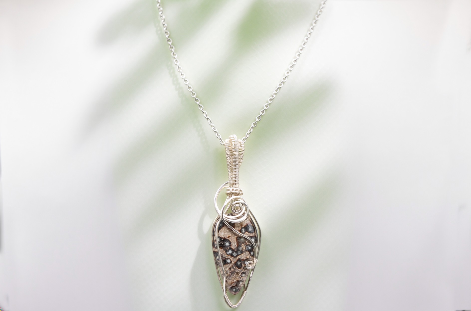 This enchanting necklace features a natural Viper Jasper gemstone, hand-wrapped in flowing silver-plated wire and suspended from an 18″ chain. Each stone carries its own unique markings — no two are ever alike — making your pendant as individual as you are.